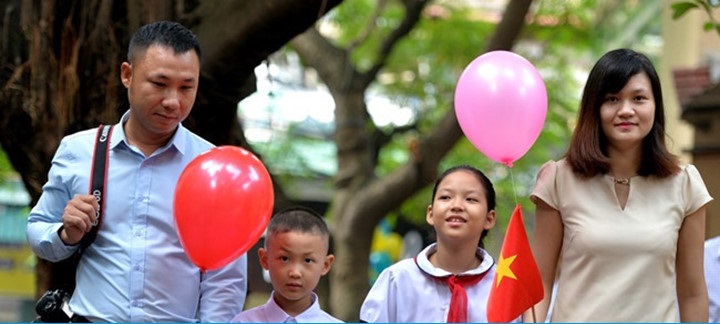 Nhiều gia đình cả bố mẹ đều thu xếp đưa con đi khai giảng - ảnh Tri thức trực tuyến. |