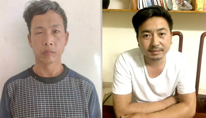 Đối tượng Sùng Sính Pó (bên trái) và Vừ Văn Lềnh (bên phải) tại cơ quan công an. Ảnh: Báo Tuyên Quang |