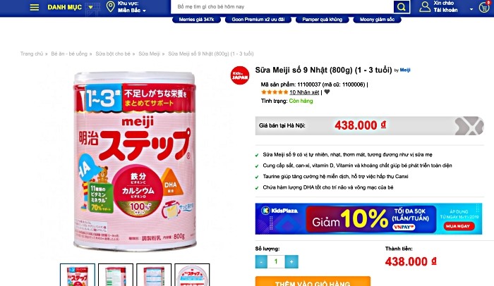 Sản phẩm sữa Meiji nội địa được Kids Plaza quảng cáo trên website |