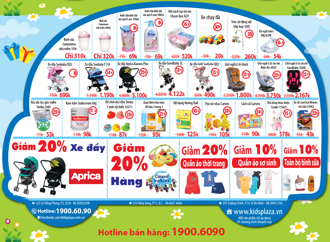 - Giảm 20\% toàn bộ xe đẩy Aprica, toàn bộ hàng Canpol Babies toàn bộ hàng Kuku, Simba, toàn bộ hàng quần áo thời trang, ghế ngồi ăn cho bé Kiza, đồ chơi cho bé, bột nặn làm kem, đồ chơi treo cũi, xe đua mini…