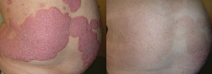 | Hình ảnh bệnh vẩy nến trước và sau 8 tuần sử dụng sản phẩm Dr Michaels® (Soratinex®). |