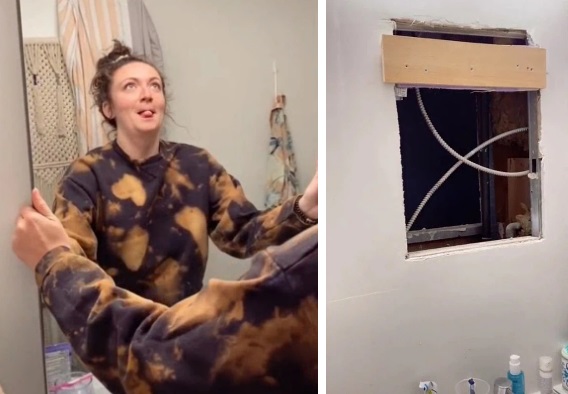 Cô gái trẻ gỡ chiếc gương trong nhà tắm ra để xem xét và vô cùng sốc khi phát hiện một lỗ hổng lớn và cảnh tượng hãi hùng phía sau.