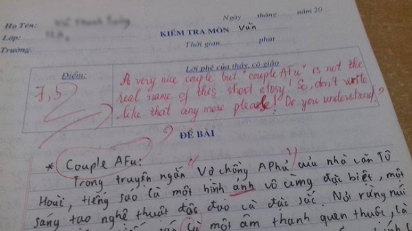 Song điều khiến nhiều người "sốc" hơn cả chính là lời phê hài hước của cô giáo bộ môn. Thấy học sinh ti toe khoe tí tài lẻ ngoại ngữ, giáo viên liền phê 1 tràng dài toàn tiếng Anh: "A very nice couple but "Couple AFu" is not the real name of this short story! So, don't write like that any more, please! Do you understand?".