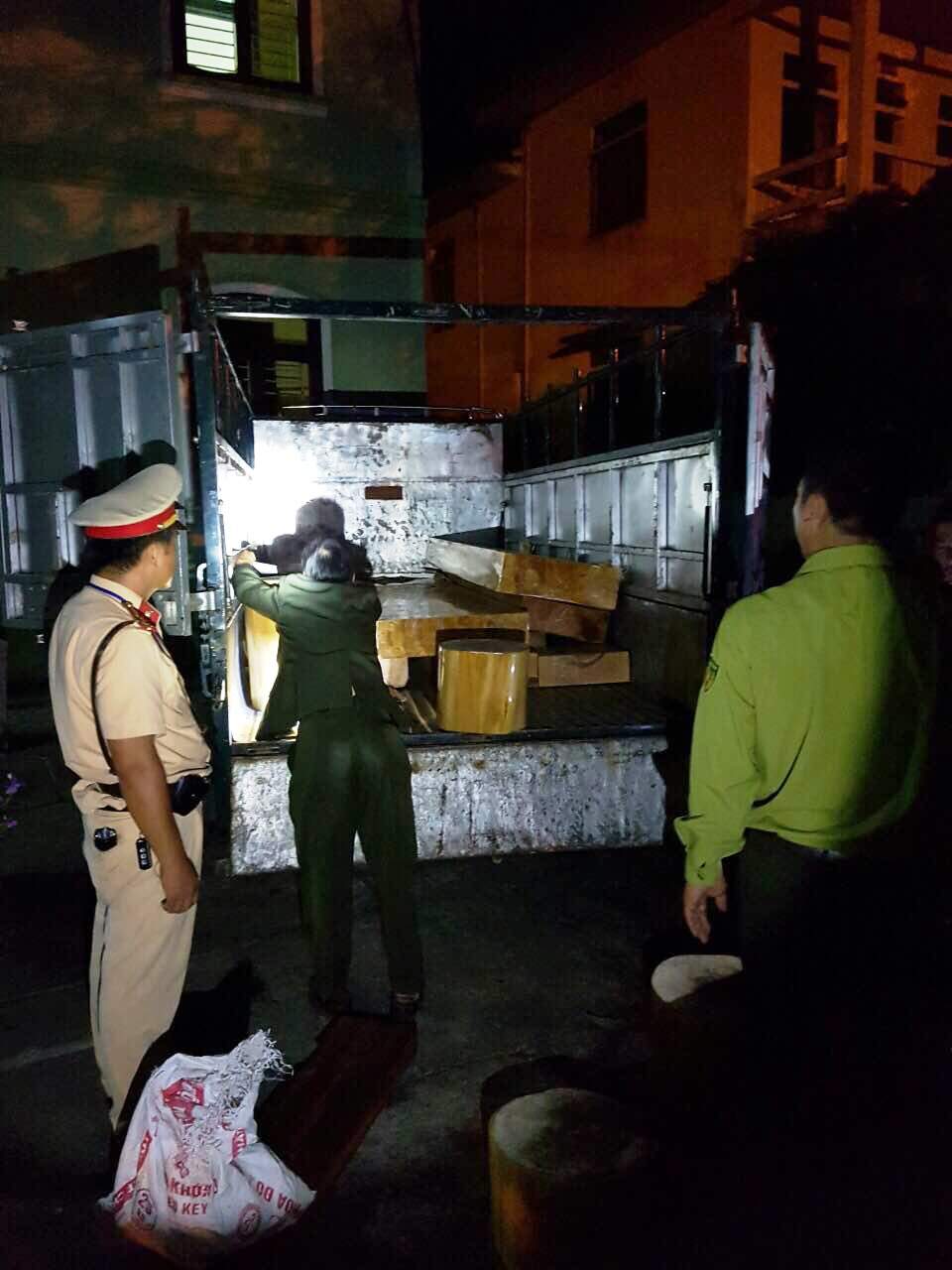 Qua kiểm tra xe, các án bộ chiến sĩ đã phát hiện trên thùng xe tải chở rất nhiều phách và khúc gỗ lớn được phủ lớp dầu bóng. Tổ công tác yêu cầu kiểm tra hóa đơn chứng từ số lượng gỗ này nhưng tài xế Sơn không xuất trình được.