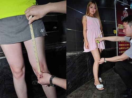 Các khách hàng nữ phải xếp hàng để các nhân viên đo… độ ngắn của chiếc váy. Một nhân viên nam cầm thước dây sẽ đo chiều dài chính xác từ đầu gối mỗi khách hàng tới gấu váy. |