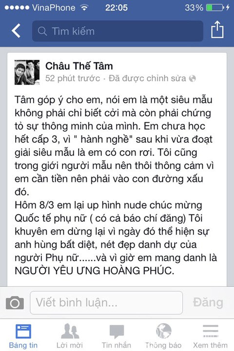 Hôm 8/3, em lại úp hình nude chúc mừng Quốc tế phụ nữ. Tôi khuyên em dừng lại vì ngày đó thể hiện sự anh hùng bất diệt, nét đẹp danh dự của người Phụ nữ...và vì giờ em mang danh là người yêu Ưng Hoàng Phúc.