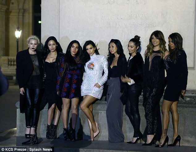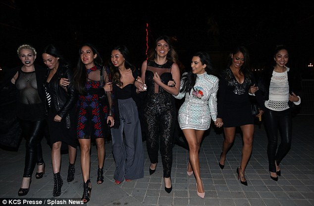 Trong một bức ảnh Kim chia sẻ trên trang cá nhân, cô viết: “Tôi là quả là một người may mắn khi có được những người bạn tốt ở khắp nơi! ##ParisNights #LastSupper.” | Sau đó, Kim cùng những người bạn của mình dùng bữa ăn nhẹ, tham gia tour du lịch nổi tiếng của Trocadero và tới những địa điểm nổi tiếng của thành phố Paris hoa lệ. | Kim vui đùa cùng nhóm bạn thân của mình. |  |  | | Cùng nhau đi thăm bảo tàng Louvre. |
