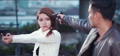 Lâm Minh Thắng chĩa súng vào đầu Kim Ny Ngọc. |