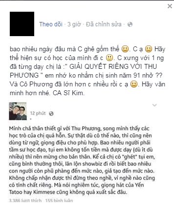 Kimmese lên tiếng sau dòng trạng thái tố ca sĩ Thu Phương nói xấu sau lưng học trò. |