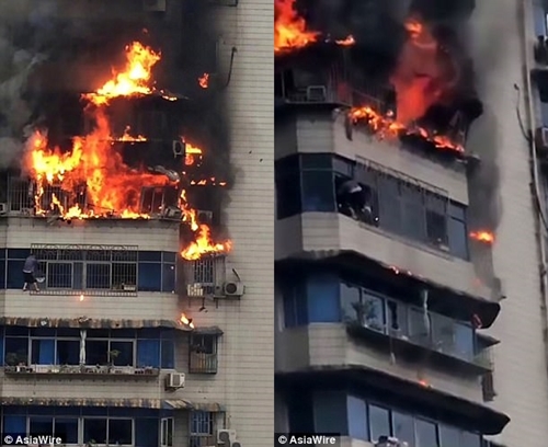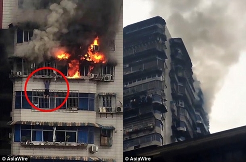 Đoạn phim được quay bằng điện thoại di động đã ghi lại khoảnh khắc nguy hiểm khi người đàn ông Trung Quốc tóm lấy các thanh kim loại chống trộm trước cố gắng chui vào căn hộ tầng dưới còn chưa bị đám cháy lan đến.