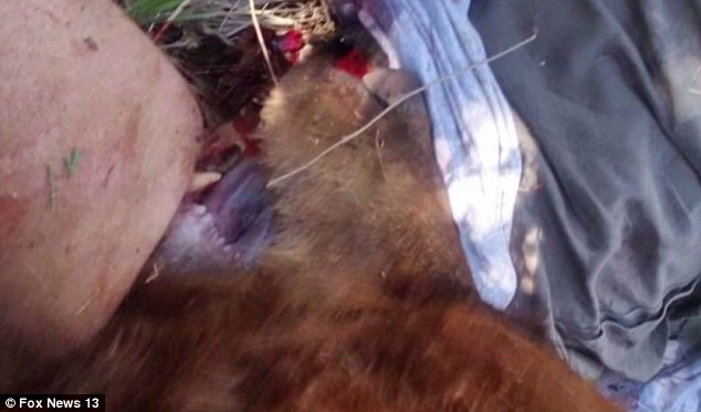 Hai hàm răng của con gấu vẫn ngoạm chặt vào chân nạn nhân dù đã bị bắn chết. Ảnh: Daily Mail. |