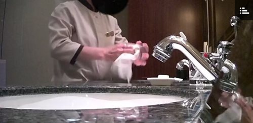 | Đoạn video còn cho thấy hình ảnh một phụ nữ lau dọn trong khách sạn Four Seasons ở Thượng Hải cũng dùng một tấm bọt biển để lau vòi tắm, kệ để đồ và cốc trong nhà vệ sinh. Ảnh: SCMP. |