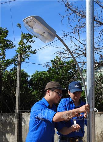 Đoàn viên Công ty Điện lực Kon Tum lắp đặt hệ thống đèn chiếu sáng tại làng Đăk Tum. |