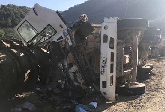 Xe tải chở đá phục vụ công trình thủy điện đang thi công bất ngờ mất phanh, lật ngang bên đường khiến 3 công nhân thương vong.