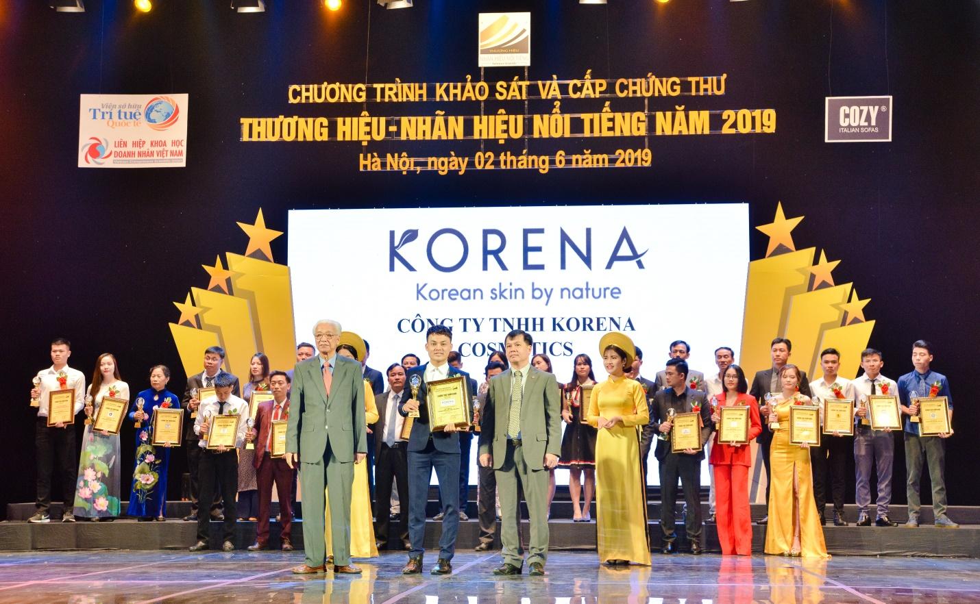 Vừa qua, chương trình truyền thông và khảo sát “Thương hiệu, Nhãn hiệu nổi tiếng lần thứ IX - năm 2019” được Viện Sở Hữu Trí Tuệ Quốc Tế, Liên hiệp Khoa Học Doanh Nhân Việt Nam kết hợp tổ chức tại Hà Nội. Đây là chương trình nghiên cứu khảo sát nhằm giúp doanh nghiệp xác định vị trí thương hiệu trên thương trường và đạt được vị trí thương hiệu nổi tiếng như mong muốn. Công ty TNHH Korena Cosmetics vinh dự đón nhận danh hiệu Top 10 “ Thương Hiệu – Nhãn Hiệu Nổi Tiếng” năm 2019.