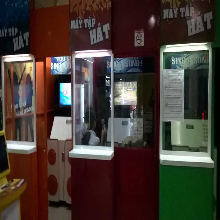 Theo ghi nhận của chúng tôi, tại TP.HCM, hầu hết các khu vui chơi giải trí dành cho thiếu nhi, trẻ em hoặc khu vui chơi giải trí nói chung trong các siêu thị, trung tâm thương mại đều có bố trí các cabin hát karaoke. Gọi là cabin là vì về hình thức nhìn nó giống một cabin của xe ô tô. Nó được thiết kế dạng hình hộp chữ nhật dựng đứng, tùy nơi, tùy điểm nhưng đa phần là dùng dạng này.