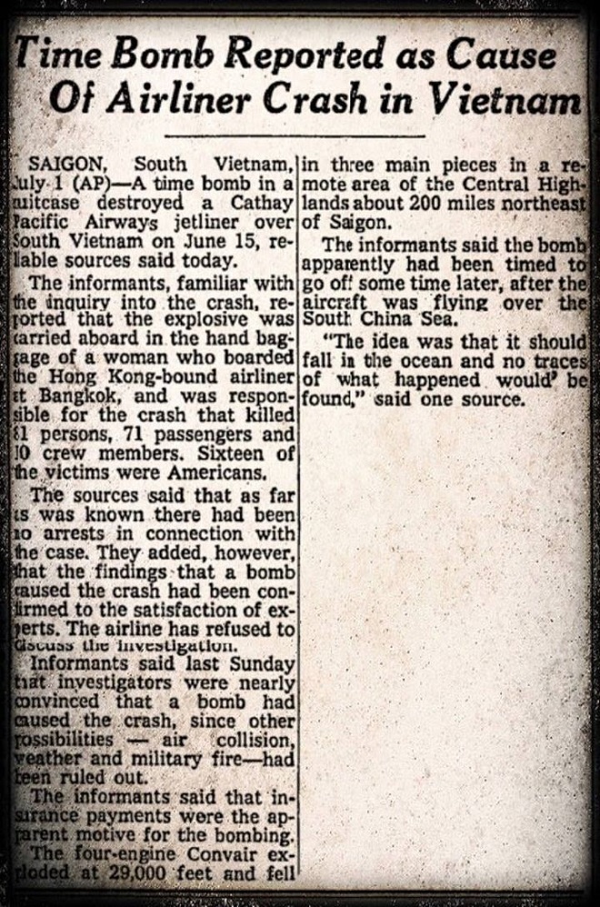 Ngày 15/6/1972, khi các hành khách đang được phụ vụ bữa trưa, chiếc máy bay Convair 880 mang số hiệu CX700Z của hãng hàng không Cathay Pacific đã bất ngờ phát nổ, lao xuống đất, vỡ thành ba phần (buồng lái, thân giữa máy bay và phần đuôi).