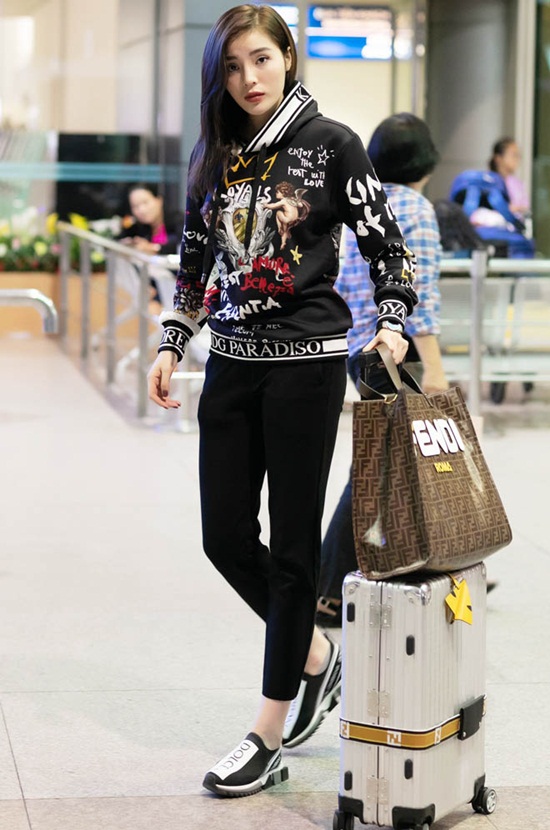 Cô diện áo hoodie và giầy thể thao của thương hiệu Dolce & Gabana, đi cùng là vali và túi xách thuộc thương hiệu Fendi. |