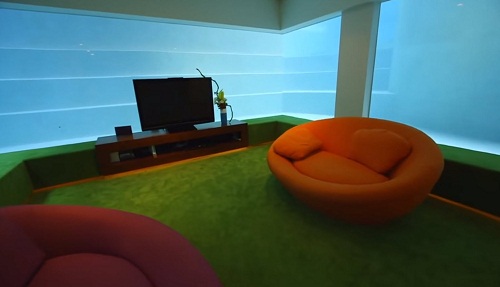 Theo đó, căn phòng độc đáo này được đặt chìm hẳn phía dưới hồ bơi, bốn quanh đều là nước. Lớp tường ngăn cách phòng được làm từ vật liệu nhựa acrylic rất bền với độ dày 4.5 inch (hơn 11cm), do đó mọi người có thể ngồi trong phòng thoải mái mà không hề phải lo tường sẽ bị nứt vỡ và nước tràn vào.