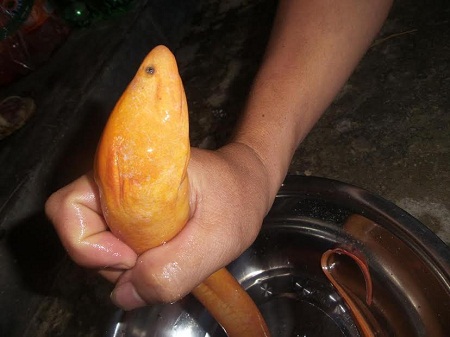 Con lươn vàng kỳ lạ nặng 500gam và dài khoảng 30cm và có hai “lỗ tai”. |