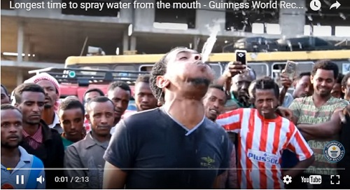 Để phá vỡ kỷ lục này, Yilma đã uống khoảng một vài chai nước trước khi nhấc miệng lên không khí và phun ra một dòng nước liên tục mà không cần dừng lại trong gần 1 phút.