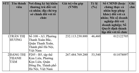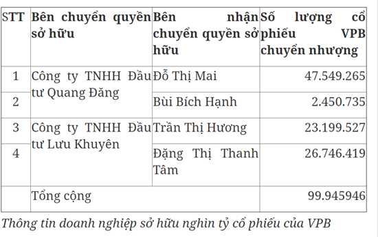 Theo thông báo này, Công ty TNHH Đầu tư Quang Đăng (Công ty Quang Đăng) chuyển nhượng cho bà Đỗ Thị Mai 47,54 triệu cổ phần và bà Bùi Bích Hạnh 2,45 triệu cổ phần. Công ty TNHH Đầu tư Lưu Khuyên (Công ty Lưu Khuyên) chuyển nhượng cho bà Trần Thị Hương 23,2 triệu cổ phần và bà Đặng Thị Thanh Tâm 26,74 triệu cổ phần.