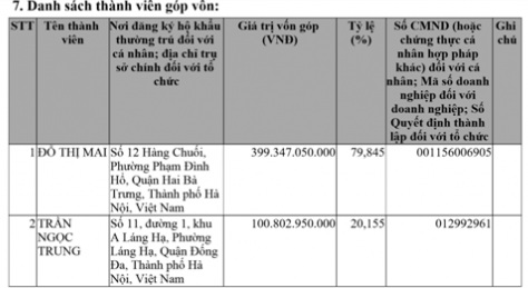 Qua tìm hiểu được biết, Công ty Quang Đăng có địa chỉ tại phòng 2, tầng 8, tòa nhà Licogi 13, số 164 Khuất Duy Tiến, Thanh Xuân, Hà Nội, mã số doanh nghiệp là: 0107929764, thành lập ngày 20/07/2017, có người đại diện pháp luật là bà Đỗ Thị Mai với 2 thành viên sáng lập với số vốn điều lệ đăng ký là: 500.150.000.000 đồng và sở hữu như sau: