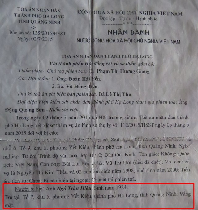 Tuy nhiên, trong quá trình chờ vụ án được đưa ra xét xử, anh Ngô Trần Hiếu bị vướng vào một vụ án khác nên bị bắt tạm giam. Đến ngày 2/7/2015, TAND TP Hạ Long đưa vụ án “Cố ý gây thương tích” ra xét xử. Mặc dù tại phiên tòa, bị hại Ngô Trần Hiếu không có mặt, nhưng HĐXX vẫn quyết định tiến hành mà không cần biết bị hại vắng mặt vì lý do gì?.