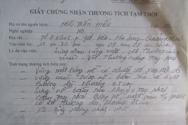 Tại bản kết luận giám định pháp y thương tích số 280/2014/TgT ngày 29/8/2014 của Phòng giám định pháp y, Bệnh viện đa khoa tỉnh Quảng Ninh kết luận anh Hiếu bị sưng nề vùng hàm, nhiều vết xây xước; Vùng mũi sưng nề, có vết thương dài khoảng 1,5cm; Sưng nề bầm tím khuỷu tay trái; Cẳng tay phải mặt sau 1/3 giữa có vết thương dài khoảng 1,5cm; gãy xương cánh mũi chính giữa… Các vết thương do vật tày gây nên làm anh Ngô Trần Hiếu bị tổn hại 12\% sức khỏe.
