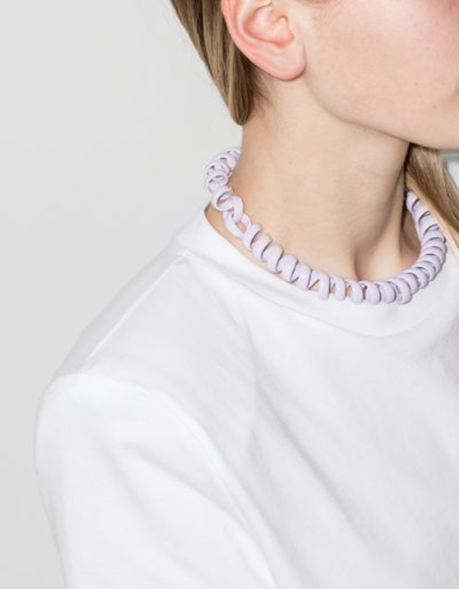 Bên cạnh màu trắng, hãng còn sản xuất vòng tông tím nhạt, hợp với xu hướng. Hoa tai và nhẫn đồng bộ với vòng cổ cũng được thương hiệu này cho lên kệ với mức giá lần lượt là 891 USD và 556 USD. |