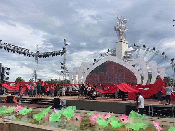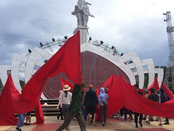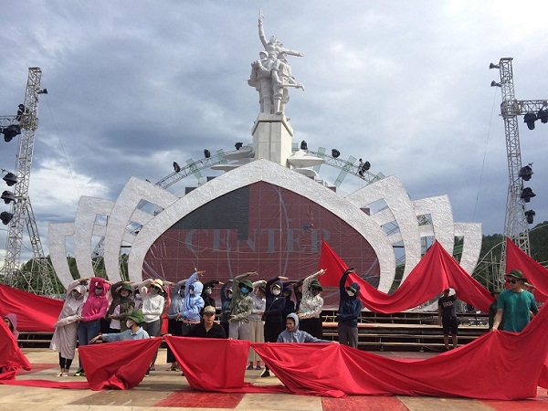 Diễn viên đoàn văn công Quân khu 1 phải "đội nắng" để ráp sân khấu. |