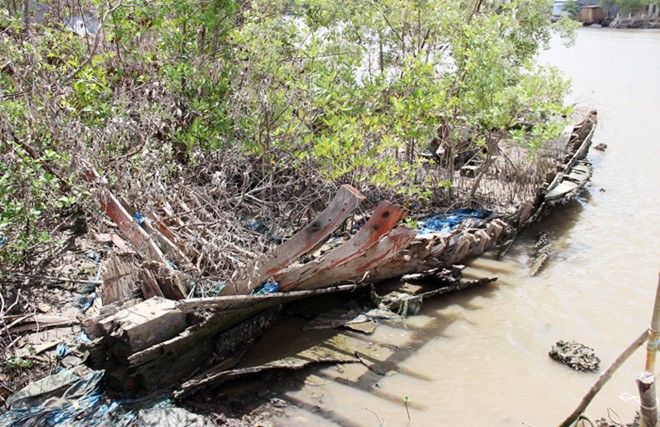 Xác tàu Diễm Tính như bộ xương cá nằm ven sông Ông Trang. (Ảnh: Việt Tường/báo Tri thức trực tuyến). |
