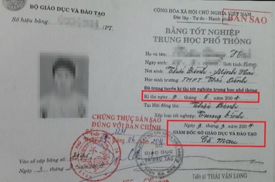 Cụ thể, trong bằng tốt nghiệp THPT của ông H. thể hiện, tốt nghiệp kỳ thi ngày 3/6/2004 tại Hội đồng thi Thới Bình. Trong khi đó, ngày cấp bằng tốt nghiệp lại là ngày 3/3/2004.