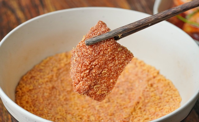 - Thịt sau khi ướp lăn đều qua bột thính sao cho bột bám đều miếng thịt.