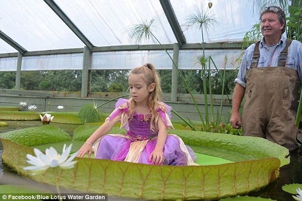 | Cháu gái của ông có thể ngồi lên mặt lá mà không bị chìm. Ảnh: Blue Lotus Water Garden |