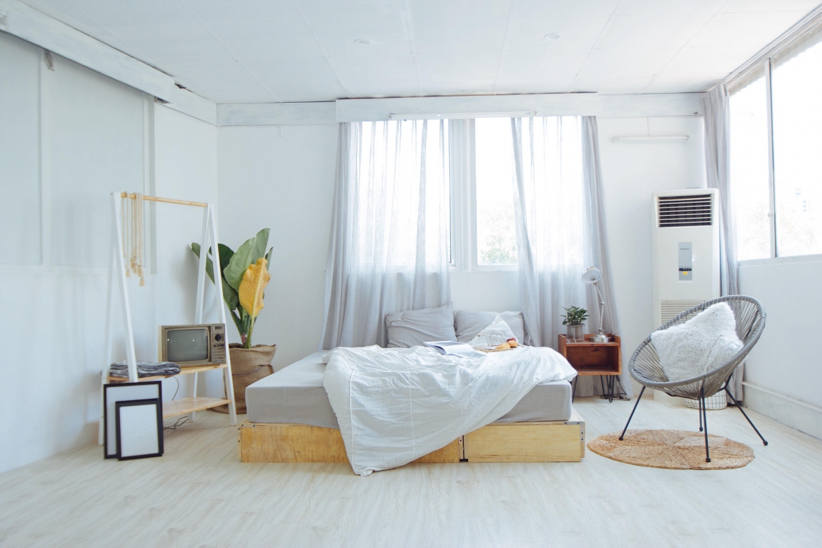 Điểm thu hút của căn phòng chính là giường ngủ rộng rãi, tràn ngập ánh nắng mặt trời. Lối sắp xếp các vật trang trí theo một cách tự nhiên nhất đã mở rộng không gian cho chốn riêng tư này.