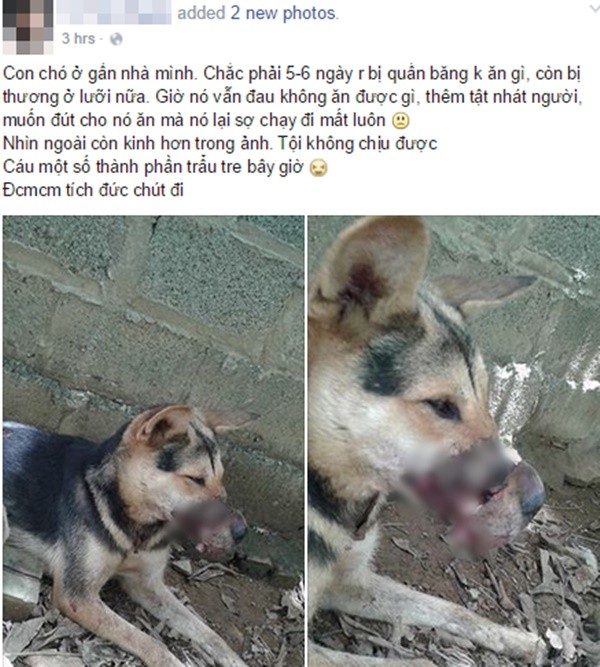 Những hình ảnh này được facebook T.K.N. chia sẻ trên trang cá nhân của mình với nội dung đầy xót xa: "Con chó ở gần nhà mình. Chắc phải 5-6 ngày rồi bị quấn băng không ăn gì, còn bị thương ở lưỡi nữa. Giờ nó vẫn đau không ăn được gì, thêm tật nhát người, muốn đút cho nó ăn mà nó lại sợ chạy đi mất luôn. Nhìn ngoài còn kinh hơn trong ảnh. Tội không chịu được".