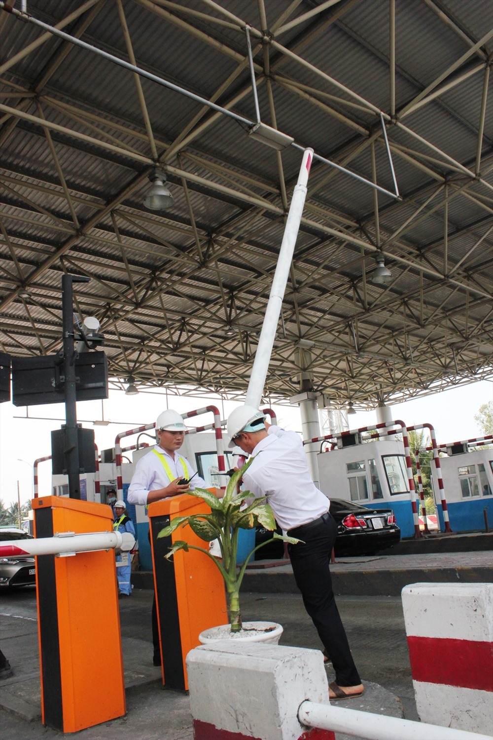 | Nhân viên trạm BOT Cai Lậy sửa lại thanh chắn bị tài xế tông (ảnh: Tr.L) |