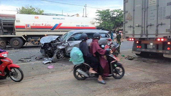 Cú tông mạnh khiến xe 7 chỗ mất kiểm soát, quay ngược lại, sau đó tông tiếp vào xe máy do anh Lâm Quang Tuyên (27 tuổi, ngụ huyện Đạ Tẻh) điều khiển chở theo vợ là Ka Khuê (28 tuổi) và con gái (5 tuổi) đang lưu thông cùng chiều phía trước.
