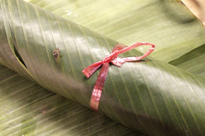 - Dùng một sợi dây nilon buộc ngang phía bên ngoài lá chuối, buộc hờ để giữ cố định.