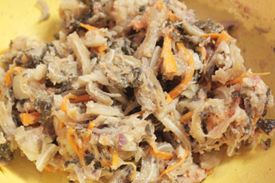 - Trộn lẫn cà rốt, hành khô, mộc nhĩ, tai lợn, thịt ba chỉ, thịt nạc xay vào âu sạch. Thêm một ít hạt tiêu, hai thìa nhỏ nước mắm, một thìa nhỏ muối, nửa thìa nhỏ hạt nêm và một thìa nhỏ đường, trộn đều, ướp khoảng 30 phút. Bạn có thể cho một ít thịt vào lò vi sóng để thử thịt có vừa miệng, nếu nhạt bạn có thể thêm gia vị.