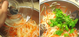 Bước 2: Cho su hào, cà rốt vào một âu to, thêm một ít muối trắng rồi bóp cho mềm, khoảng 2 phút rồi vắt.
