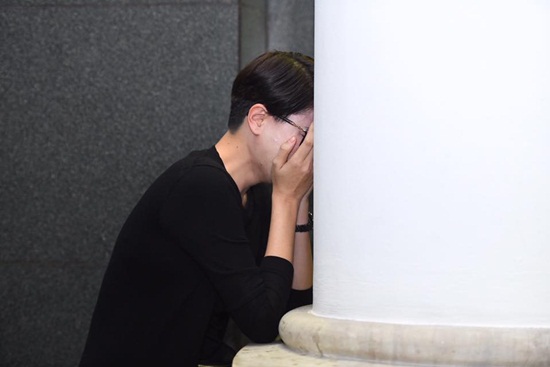 | Trang Trần đứng một góc, úp mặt vào tường nức nở vì sự ra đi của người thầy đáng kính. Ảnh: Dân Việt |