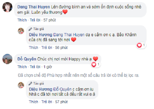 Tài khoản có tên Dang Thai Nguyen viết: "Lên đường bình an và sớm ổn định cuộc sống nhé em gái. Luôn yêu thương". Ngay phía dưới, Diệu Hương trả lời: "Dạ em cảm ơn chị ạ. Bảo Khánh của chị đã sang tới nơi (Mỹ- PV)".