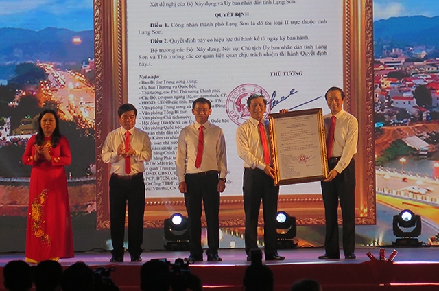 | Ông Phạm Ngọc Thưởng – Chủ tịch tỉnh Lạng Sơn, trao Quyết định của Thủ tướng Chính phủ công nhận thành phố Lạng Sơn là đô thị loại II, cho tập thể lãnh đạo thành phố Lạng Sơn. |
