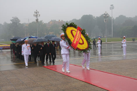 ![]() Đoàn đại biểu Ban Chấp hành Trung ương Đảng, Chủ tịch nước, Quốc hội, Chính phủ, Ủy ban Trung ương Mặt trận Tổ quốc Việt Nam vào Lăng viếng Chủ tịch Hồ Chí Minh. Ảnh Công an nhân dân. |