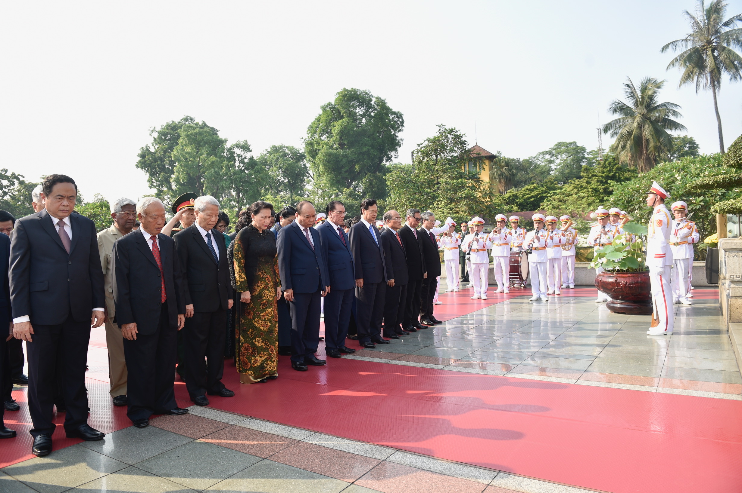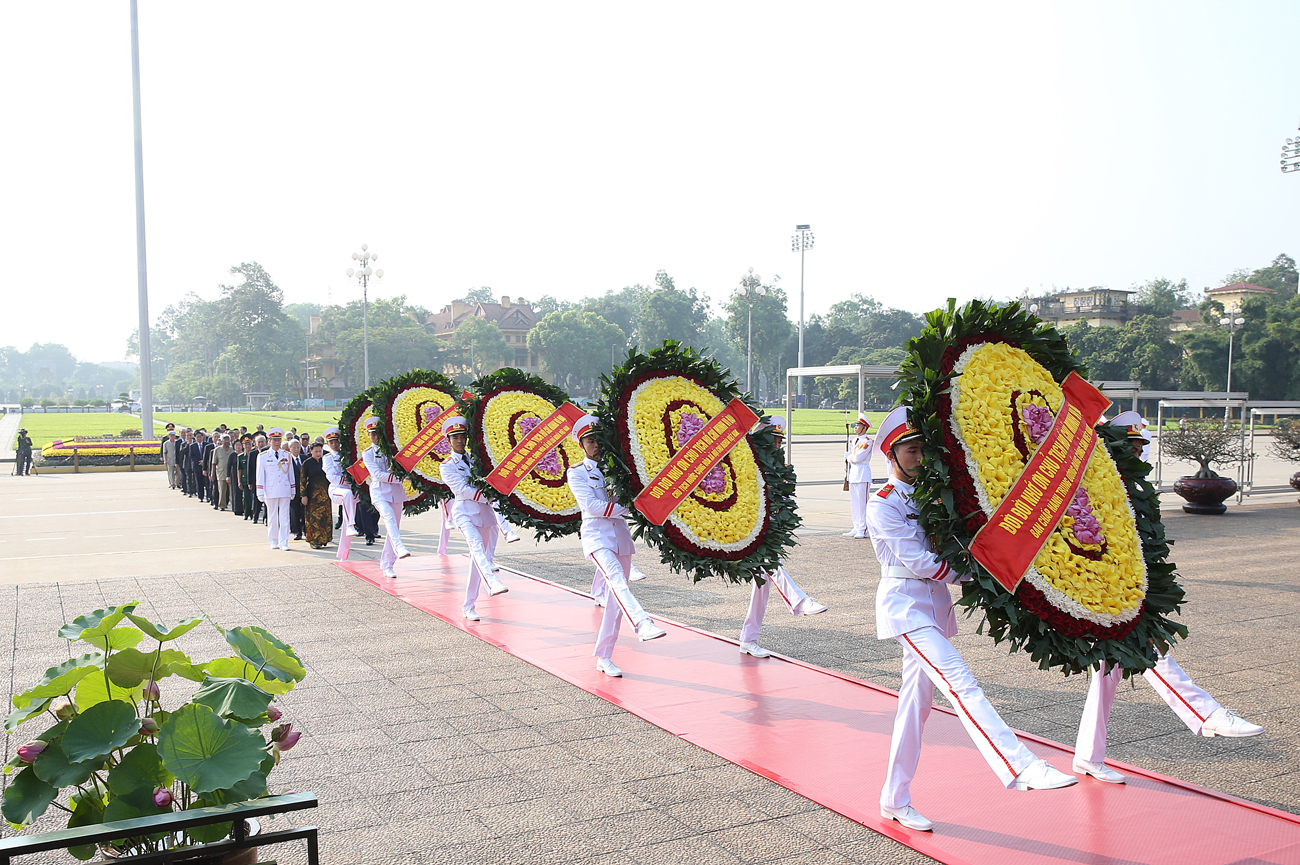 Các đồng chí lãnh đạo Đảng, Nhà nước, MTTQ Việt Nam tới đặt vòng hoa, vào Lăng viếng Chủ tịch Hồ Chí Minh; thành kính bày tỏ lòng biết ơn vô hạn với công lao to lớn của Người đối với sự nghiệp cách mạng vẻ vang của Đảng và dân tộc ta.