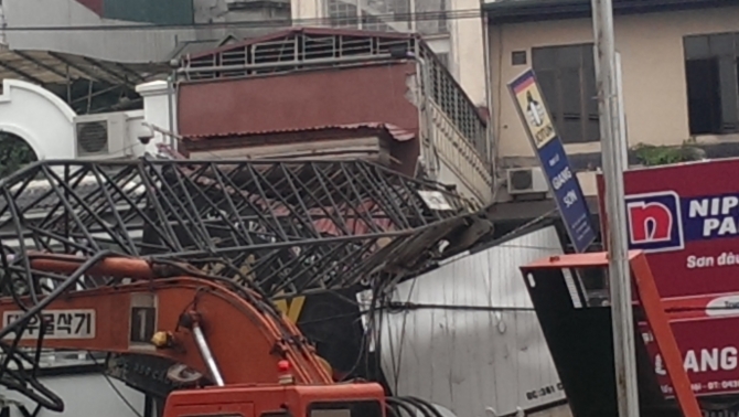Tại hiện trường, cánh tay cẩu nặng hàng tấn nằm đè lên các biển quảng cáo của hai cửa hàng vàng bạc và đại lý sơn. Mảnh nhựa, kính và sắt thép vương vãi khắp nơi. Chiếc cần cẩu đổ chắn ngang đường Cầu Giấy và làm toàn bộ giao thông trên tuyến đường này bị ùn tắc theo hướng về phía Cầu Giấy.