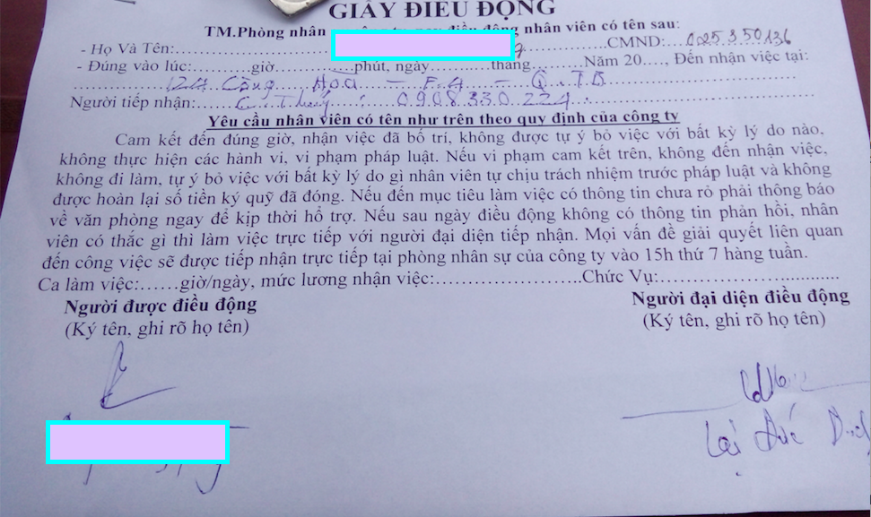 "Giấy điều động" PV đi nhận việc nhưng thực chất là đến điểm khác đóng thêm tiền đồng phục. |