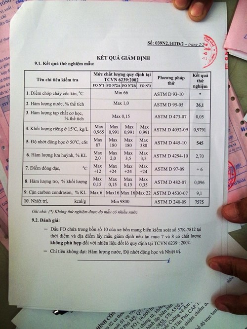 Đáng chú ý, sau khi lấy mẫu dầu của 4 xe đưa đi xét nghiệm, đến ngày 5/4, Công an quận 7 phát hiện 3 xe bồn (57K - 5858, 57K-7812, 57L-5556) chở dầu FO có hàm lượng nước từ 21,2 - 26,2\%, vượt 26 lần so với quy định và xe bồn 57L-2525 không có hóa đơn, không có niêm chì đúng theo quy định.